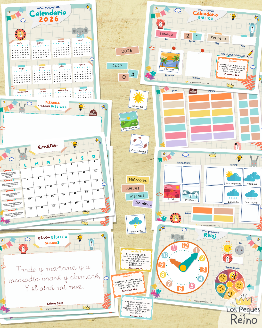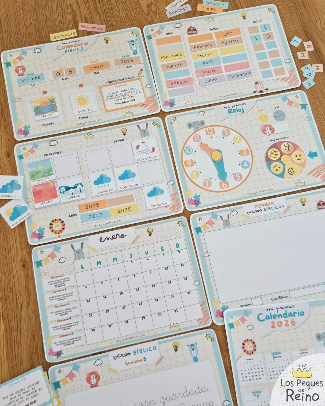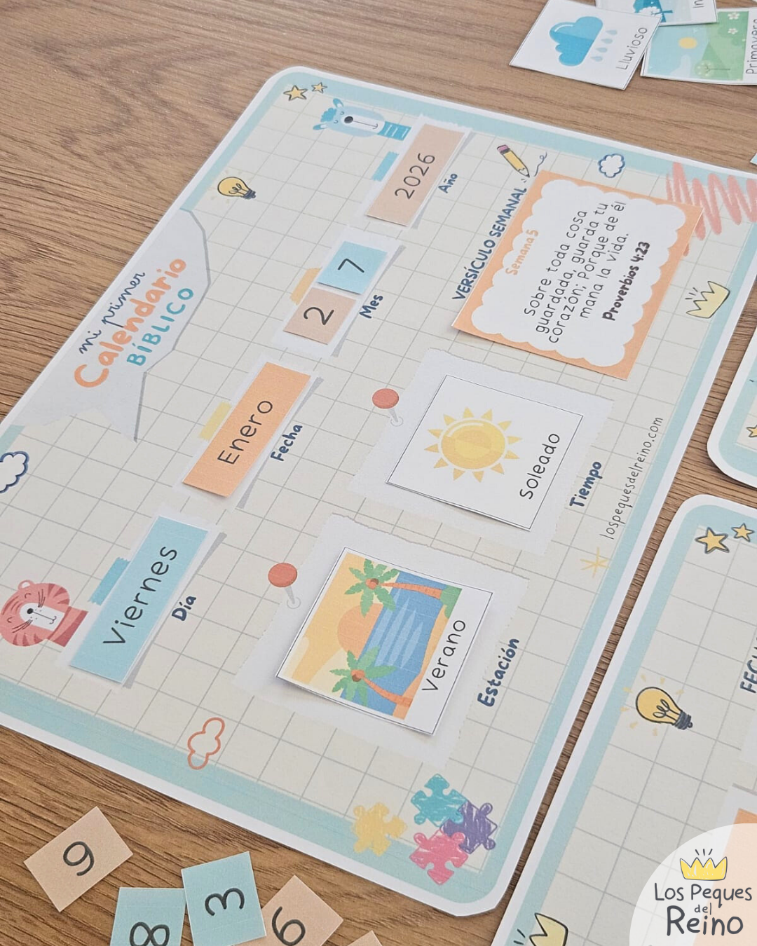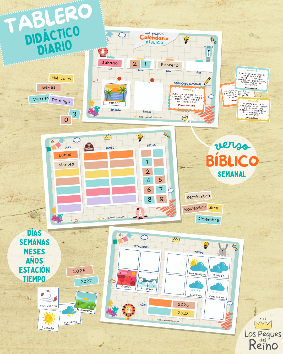 Con este Calendario los peques aprenderán a orientarse en el tiempo de una forma divertida usando sus láminas para ir armando la fecha de cada día en el tablero didáctico. También descubrirán un versículo cada semana para luego trazar el que corresponde en su pack de escritura, ayudándole a ejercitar su motricidad fina y lectoescritura. Con el calendario mensual podrán aprender a visualizar los días del mes y los versículos bíblicos que corresponden a cada semana y aportar a las planificaciones o actividades que decidan apuntar allí para hacer durante el año.