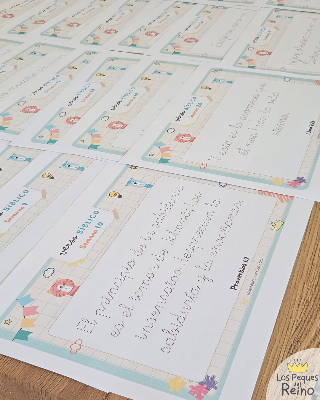 🔵Tarjetas Versos Bíblicos: Son 53 tarjetas con los versos bíblicos que los peques deben pegar cada semana en el tablero del calendario. Los versículos corresponden a la misma selección que el año anterior 2025.