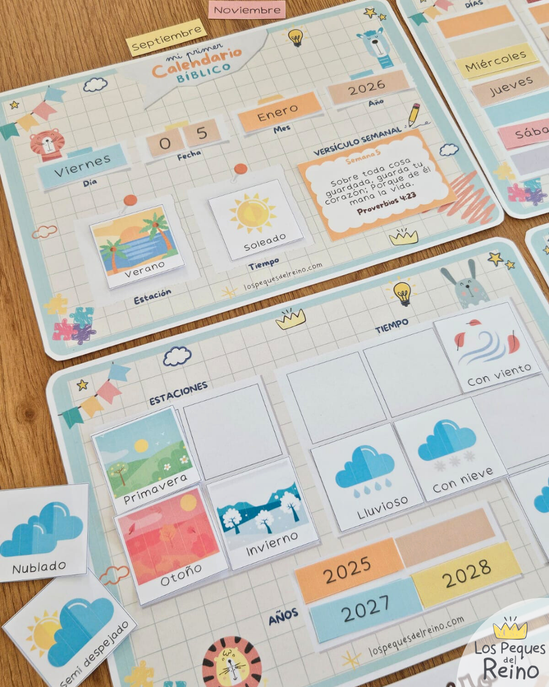 🟠Tablero Mi primer Calendario: consta de 3 tableros didácticos educativos para usar cada día del año con láminas para armar y aprender las fechas, días del año, estaciones, el tiempo y un versículo por cada semana.