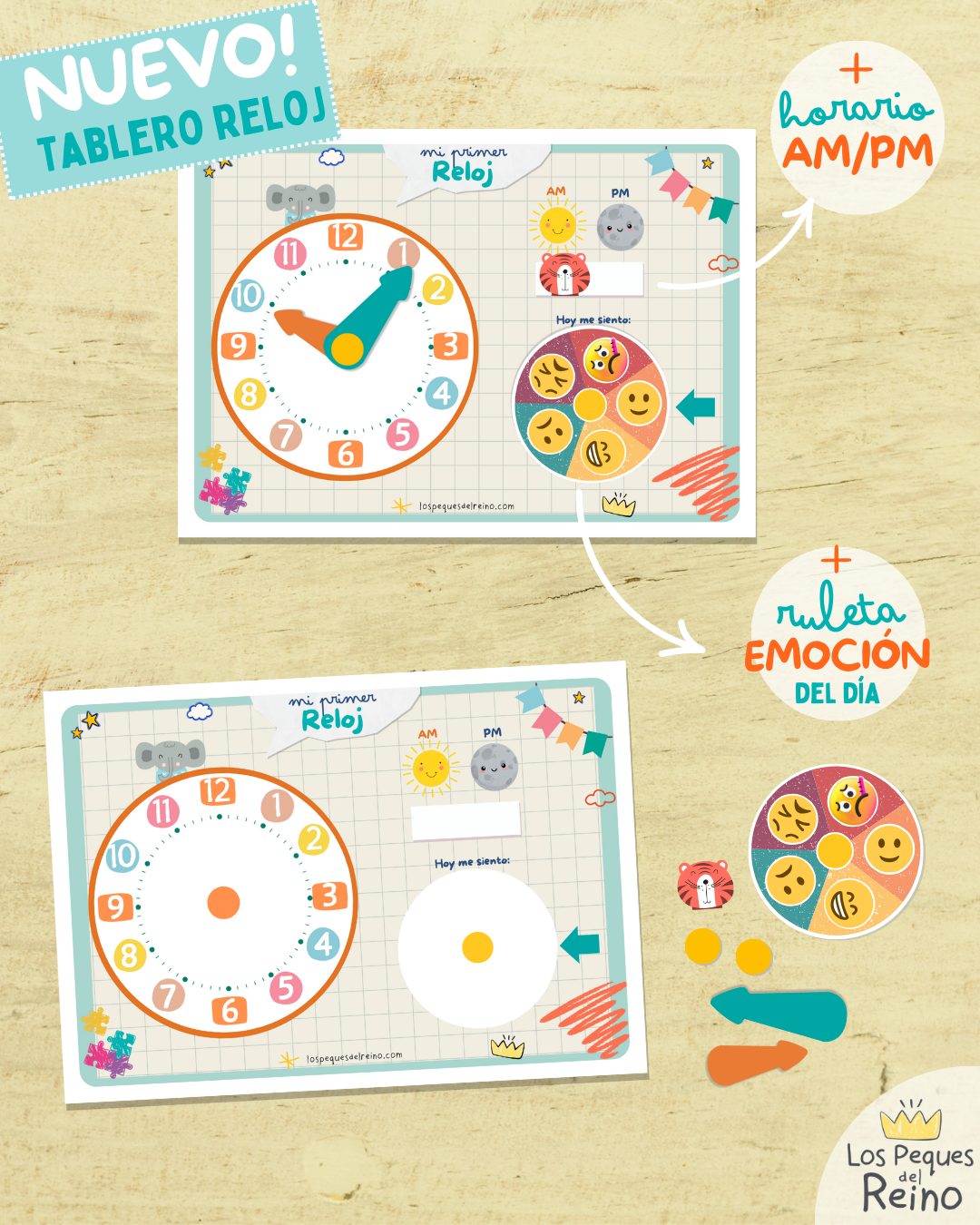 🔵NUEVO: Tablero Reloj: Incluye un tablero didáctico y página con los recortes de las manecillas del reloj, la ruleta de emociones y el recorte del dibujo de "tigre" para marcar el horario AM. y PM.
